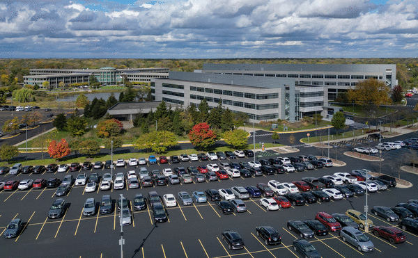 The main gray stone-and-glass building, completed in 1988, features a prominent four-story rotunda at the center, stretching out with wings on either side. The three additional buildings, which feature the same facade, opened in 2003, connected by glass skywalks.