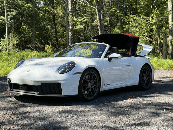 As Porsche enters Grasso’s Garage for the last time in 2025, we recognize a symbol of historical excellence: The 911 Carrera. Our GTS Cabriolet week-long tester was outstanding in the foothills of the Catskill Mountains in upstate New York as the windy and mountainous terrain were just the fit for a nice three-day top-down weekend cruise. Our 911 GTS Carrera Cabriolet's white exterior, black interior and red convertible top paired nicely with the high-gloss black brake calipers.
